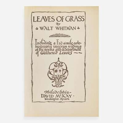 Camden (New Jersey), May 5, (18)91. Autograph note on postcard, signed by Walt Whitman to his friend and supporter, the biographer and editor, William Sloane Kennedy: "Camden May 5 '91 / Thanks for yrs rec'd this / forenoon--Am pretty sick / yet---was taken out to the / cemetery, (Harleigh) to see if I / was satisfied with the work on my / burial house--entirely so--you will / see it one day--Walt Whitman"; addressed on verso by Whitman, "Sloane Kennedy / Belmont Mass:". Tipped-in to Leaves of Grass (Philadelphia: David McKay, [1900]). Reprint. Publisher's green cloth, stamped in black and in gilt, foot of spine chipped, headcap frayed; top edge gilt, other edges trimmed; gutter split at p. (iii); book-plate of clergyman Minot Osgood Simons on front paste-down. BAL 21452 Less than a year before the poet's death, Walt Whitman writes to his friend and supporter, the biographer and editor, William Sloane Kennedy (1850–1929), recounting a visit to his then-incomplete and self-designed tomb at Harleigh Cemetery in Camden, New Jersey. Born in Brecksville, Ohio, Kennedy was one of Whitman's most devoted admirers and defenders later in the poet's life. He first met Whitman in Philadelphia in 1880 while working on the staff of the American, and until the poet's death, in 1892, they were frequent correspondents. Kennedy penned several essays on Whitman, and in 1896 published Reminiscences of Walt Whitman with Extracts from His Letters and Remarks on His Writings, edited Walt Whitman's Diary in Canada (1904) and, in 1926, published The Fight of a Book for the World: A Companion Volume to "Leaves of Grass." Provenance