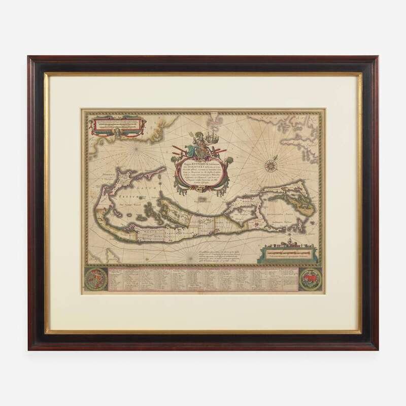 Amsterdam, (ca. 1640). Engraved map with hand-coloring. Latin text on verso. Approximately 16 1/4 x 21 1/4 in. (412 x 540 mm) (sight). In mat and unexamined out of double-pane glass frame, 25 5/8 x 30 1/2 in. (651 x 775 mm). Handsome map of Bermuda, based on the 1617 survey conducted by Richard Norwood on behalf of the Bermuda Company, the first survey of the archipelago. As depicted here, the islands were divided into eight "Tribes," corresponding to the Company's principal shareholders or proprietors, with the land then further divided into smaller lots. A table at bottom lists the over 150 shareholders arranged according to their proprietor, as well as a key to identify their lot on the map and their number of shares. The decorative cartouche at center depicts Neptune astride the Royal Arms holding a ship. Interestingly, the map includes two depictions of Bermuda, the larger one depicting Norwood's survey, and a small depiction below the cartouche showing the island's position and size relative to Cape Cod, Nova Scotia, Virginia, Florida, and England.