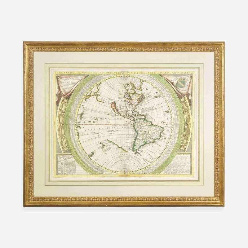 (Venice, 1691). Engraved hand-colored map, 19 1/2 x 26 3/8 in. (495 x 670 mm). Second state (of two), with zodiacs illustrated at left and right. Scattered light soiling in margins; small repaired closed tear, bottom left corner. In mat and in frame, 28 1/4 x 34 1/4 in. (717 x 870 mm). Shirley 548 A handsome example of Italian cartographer Vincenzo Maria Coronelli's map of the Western Hemisphere, showing California as an island, and with an early depiction of New Zealand's coastline. From his atlas, Atlante Veneto (1691), "this map is one of the most decorative published by Coronelli and is derived from his large 1688 printed gores, themselves drawn from the glorious 490-centimetre manuscript globe constructed for Louis XIV in 1683." (Burden). Provenance