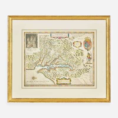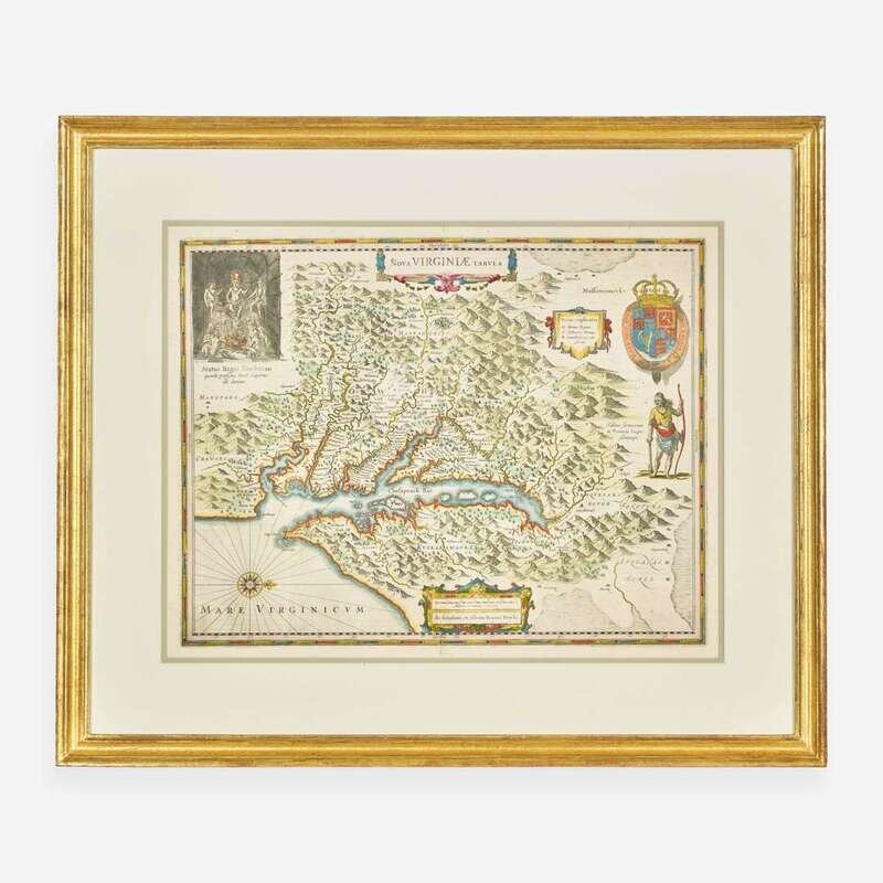 Amstelodami: Henrici Hondii, (ca. 1666). Engraved map with later hand-coloring; 19 3/4 x 23 1/4 in. (502 x 590 mm). First state (of two). Latin text on verso. Residue along central fold verso; scattered very small chipping along edges. In mat and in frame, 23 3/4 x 28 1/8 in. (603 x 714 mm). Burden 228; Tooley, pp. 165-166 Henricus Hondius's derivative of Capt. John Smith's highly important 1612 map of Virginia, the first to accurately depict the Chesapeake Bay. Provenance
