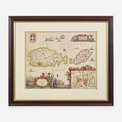 (Amsterdam, ca. 1650). Hand-colored engraved map. Approximately 16 1/2 x 20 1/2 in. (419 x 521 mm) (sight). In mat and in frame, 25 3/8 x 29 5/8 in. (644 x 752 mm). Handsome and scarce hand-colored map of Malta from Jan Jansson's Atlas Novus, with an inset plan of Valetta.