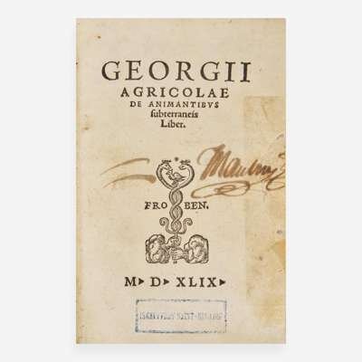 (Basel): (Hieronymus) Froben, 1549. First edition. 12mo. 79, (29), (4) pp. Froben's engraved printer's device on title-page and verso of final leaf. Full contemporary brown calf, stamped in gilt, rebacked, extremities rubbed, light soiling to boards; speckled red edges; endpapers sometime renewed; ownership signature on title-page; first eight leaves (including title-page) on stubs, with repairs to fore- and bottom edges, possibly supplied from another copy; fore-edge repaired, pp. 17-22, dampstaining in upper and lower edges, and occasionally in fore-edge of same and remaining leaves; scattered light soiling to text. With the green library ink stamp of French zoologist Isidore Geoffroy Saint-Hilaire at bottom of title-page. A rare first edition of Agricola's essay on subterranean animals and fauna, including passages on cave-dwelling birds, lizards, fish, insects, and troglodytes, as well as more fanciful creatures like trolls and goblins. The essay is largely a compendium of Greek, Latin, and medieval sources, but is supplemented by Agricola with his own observations, questions, and criticisms. Of note is an extensive index of animals at rear, listed in Latin and German, and grouped by their form of locomotion, such as walking, crawling, swimming, flying, and burrowing. The work was later appended to editions of Agricola's authoritative text on mining and metallurgy, De re metallica (1556), but was only published as a separate edition here and in a later 1614 Wittenberg reprint. Isidore Geoffroy Saint-Hilaire (1805-61) was a French zoologist who studied anatomy and is noted for his work on congenital abnormalities in humans and animals. In 1832, he published Histoire générale et particulière des anomalies de l'organisation chez l'homme et les animaux (General and Particular History of Structural Monstrosities in Man and Animals), where he defined the term teratology as the study of congenital abnormalities, and helped establish it as a field of scientific study. Rare to market, this is the first copy we can locate at auction in 45 years.