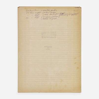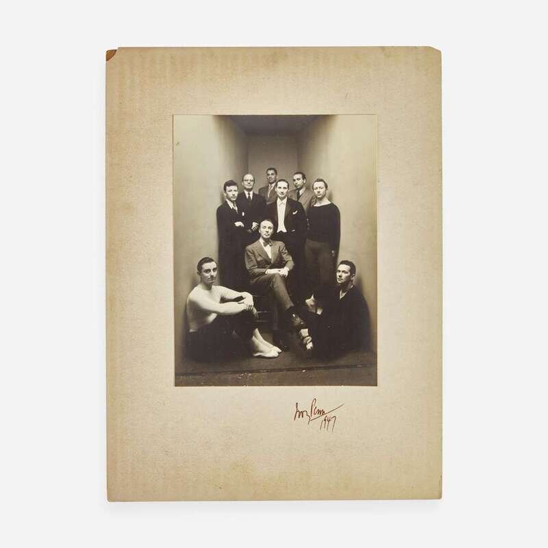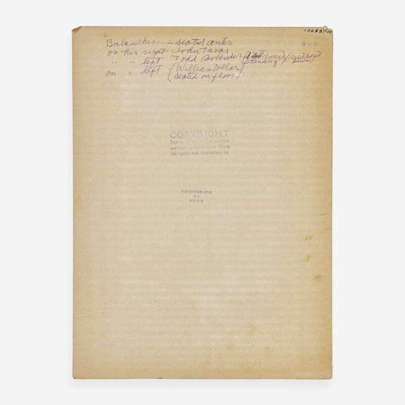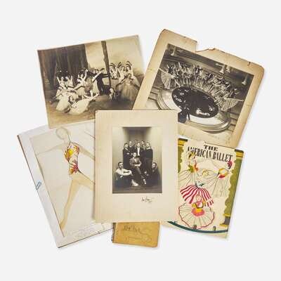 (New York), ca. 1930s-1950s. Mini-archive from the estate of Yvonne Patterson, a professional ballerina and dance instructor, who was a student in the inaugural class of the School of American Ballet, founded by legendary choreographer George Balanchine. Size and condition varies. Comprising: 1. Penn, Irving. Balanchine and Members of the American Ballet Theatre. Gelatin silver print, signed and dated by Penn on mount (“Irving Penn 1947”); with Penn and Conde Nast ink stamps on verso of mount. Four members of the company identified by Patterson in ink on verso of mount, including her husband William Dollar. 8 7/8 x 6 5/8 in. (228 x 172 mm) (image); 14 ⅞ x 11 in. (378 x 279 mm) (mount). 2. Spiral bound notepad belonging to American dancer and choreographer William Dollar, according to a note from Patterson, included here. Comprising two pages of notes, and twelve pages of choreography, in pencil, for his ballet “Constantia'' and annotated in his hand. Constantia (1944) was the first ballet choreographed by Dollar, with collaboration from Balanchine. The notepad also includes several sketches attributed to Balanchine, including a few of penises. Patterson’s note also states that, “All drawings are Balanchine. Bill and he were fooling around...Balanchine called them ‘Flying penises’ there were more but either lost or stolen. They were just having fun. Balanchine always little sex games.” Additional note laid in listing members of the company. 3. Souvenir program from a South American tour of The American Ballet, ca. 1935, signed by 30 members of the company, including: George Balanchine, Eleanor McLean, Mary Sale, Edward Warburg, Eugene Loring, Joe Lane, William Dollar (twice), Heidi Vosseler, Anne Hamilton Campbell, Felicia Perry, Edward Caton (dated 1935), Blanche Feldsher, Giselle Caccialanza, Paul Haakon, Frances Mann, Leda Anchutina, Helen Leitele, Holly Howard, Ruthanna Boris, Kathryn Mullowney, Elena de Rivas, Charles L. Laskey, Annabelle Lyon, Yvonne Patterson, Elise Reiman, Jack Potteiger, Hortense Kahrklin (as “Hortense Kahrklinsch”), George A. Birse, and two others. 4. Vintage photograph, 10 5/8 x 13 3/4 in. (275 x 355 mm), ca. 1945, depicting Yvonne Patterson, Marie-Jeanne Godwin (“Marie-Jeanne”), Nicholas Magallanes (“Nicky Magallanes”), Patricia Wilde (“Pat White”), and nine other dancers, in a production of Faust at the Opera de Bellas Artes in Mexico City during George Balanchine’s American Ballet tour to Mexico. 5. Vintage gelatin silver print, 9 3/8 x 12 3/8 in. (229 x 305 mm) (image), 12 ½ x 15 in. (218 x 381 mm) (mount), ca. 1936, depicting George Balanchine and the American Ballet in a production of the Ziegfeld Follies, on Broadway. “Coburn - Keyes” in pencil on mount, presumably the photography studio. Small chip to bottom right corner of image; mount with several closed tears and chips, none affecting image. 6. Original costume design by dancer and artist Geoffrey Holder. Label on mat: ”Costume Design by Geoffrey Holder / for / The Leaf and The Wing / Ballet by William Dollar / Ballet Theatre Workshop / New York, April 1954.” We have been unable to determine if a production of The Leaf and The Wing was ever mounted but Dollar choreographed Concerto, set to the music of Felix Mendelssohn, for the Ballet Theatre Workshop that same year. George Balanchine (1904-1983) was a Georgian-born choreographer who emigrated to America with the aim of establishing a classical ballet academy. Bringing with him the training he received at Russia's Imperial Ballet School, Balanchine founded the School of American Ballet in New York City, which opened on January 2, 1934 and enrolled 32 students, including Yvonne Patterson. He would go on to found the prestigious New York City Ballet in 1948, and have one of the longest and most successful careers in the history of dance. By the time of his death in 1983, Balanchine had choreographed over 400 performance routines, and founded his own genre of dance: neoclassical ballet. Yvonne Patterson (1910-2010) was an Australian-born ballerina and teacher. As a teenager she moved to New York City hoping to join the Radio City Ballet, but was instead accepted into the first class at the School of American Ballet. There, while studying under Balanchine, she met her future husband, William Dollar (1907-1986), a fellow dancer who also became a successful choreographer. Eventually Yvonne and her husband both transitioned to teaching, and lived out the rest of their lives in Flourtown, Pennsylvania. An archive of Patterson and Dollar’s photographs, scores, scrapbooks, and correspondence is held by the New York Public Library. Geoffrey Holder (1930-2014) was a Trinidadian artist who danced for the Metropolitan Opera, won a Tony award for his costume designs used in The Wiz (1975), and was also a recipient of the Drama Desk Award for Outstanding Costume Design. He was also a friend of Patterson and Dollar’s, and the three occasionally collaborated throughout the 1950s.