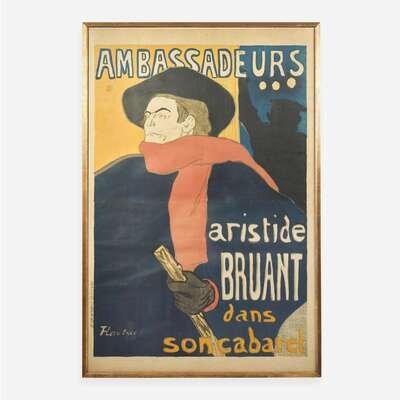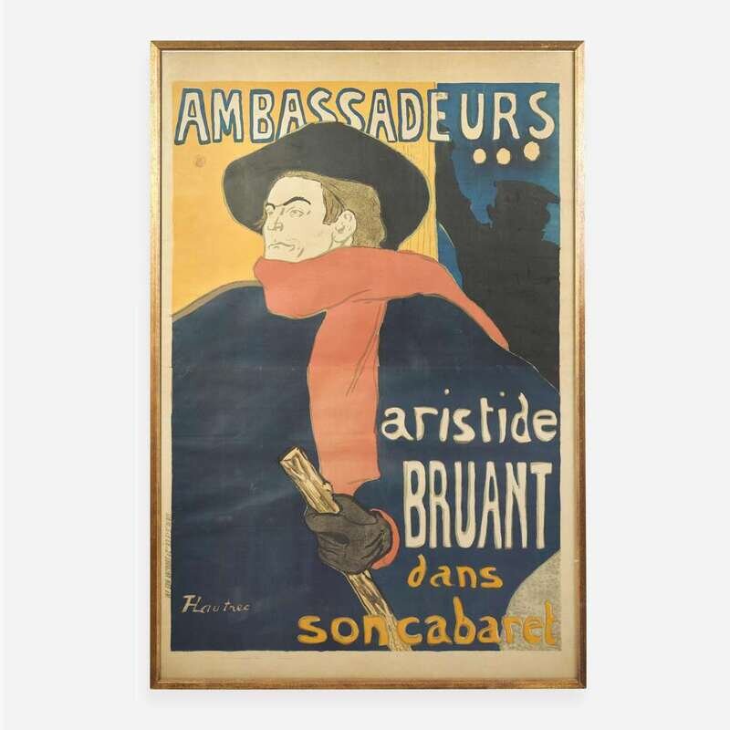 (Paris): Imp. Edw. Ancourt & Cie, (1892). Color lithograph. Laid down on wove paper; creasing from contemporary folds; Republique Francaise tax ink stamp in top left; small repairs to top left corner; scattered small areas of repairs and indiscreet in-painting. 58 7/16 x 39 1/8 in. (1484 x 994 mm). In frame, 60 x 40 1/4 in. (1524 x 1022 mm). Wittrock P4 A handsome and bright example of Henri de Toulouse-Lautrec's iconic poster, designed to promote his friend and supporter, the popular Parisian cabaret singer Aristide Bruant. Bruant commissioned the poster himself on behalf of the Ambassadeurs club where he performed, and where he was known for his commanding wit and underworld persona. The director of the club found the poster shocking and refused to display it, prompting Bruant to threaten to cancel his shows. The poster was subsequently plastered all around Paris. This is the first of three posters Lautrec designed for Bruant. Provenance