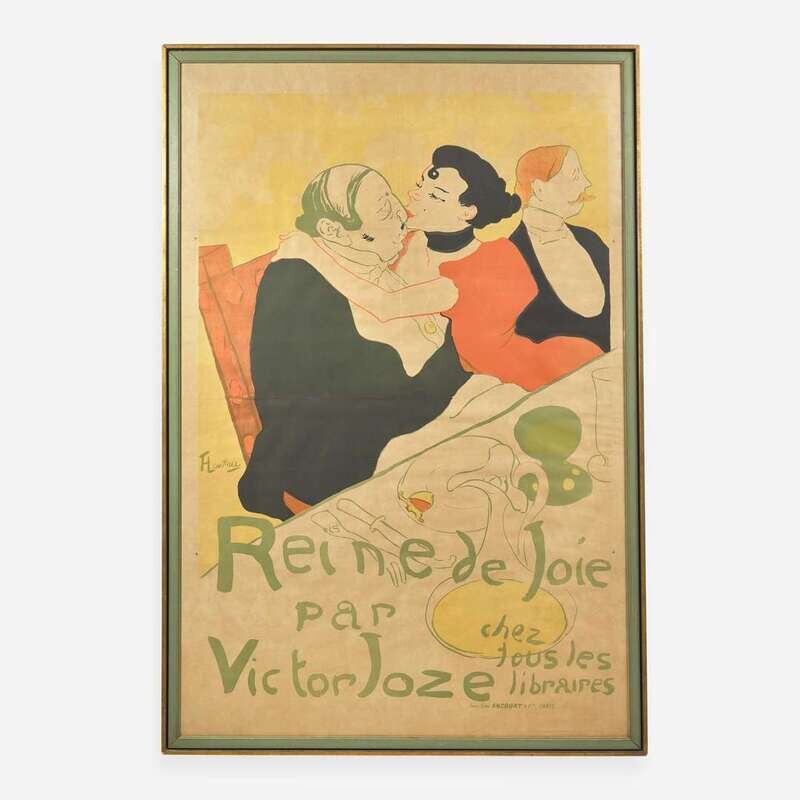 Paris: Imp. Edw: Ancourt & Cie, (1892). Color lithograph. Laid down on light wove paper; creasing from contemporary folds, small losses and indiscreet restoration along same, especially in upper portion; sheet evenly toned. 59 1/4 x 39 1/4 in. (1505 x 997 mm). In frame, 61 3/4 x 41 3/4 in. (1568 x 1060 mm). Wittrock P3 A handsome example of this colorful poster by Henri Toulouse-Lautrec, printed to advertise Victor Joze's controversial and popular novel Reine de joie (Queen of Joy). Joze was known for his risqué narratives that centered around Montmartre nightlife and prostitution, and the novel follows a young courtesan's relationship with a wealthy Jewish banker, Baron de Rosenfeld, a character loosely based on the real-life Baron Alphonse James de Rothschild. Alphonse recognized the veiled likeness and attempted to stop the book and poster’s publication, and subsequently attempted to destroy copies displayed in bookstores. Provenance