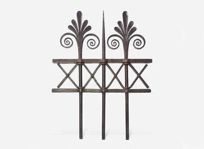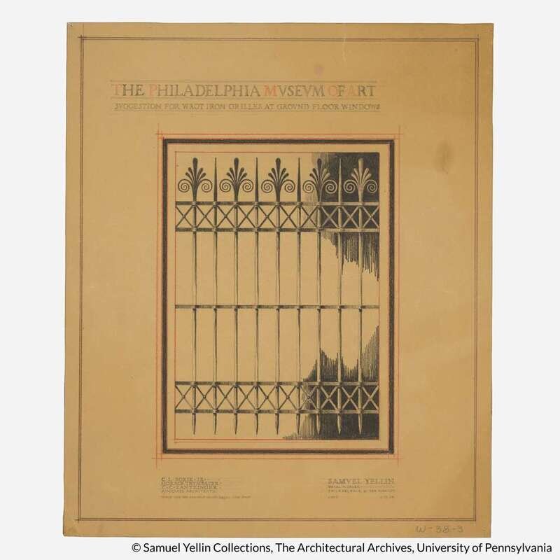 This “sketch in iron” was for an unrealized commission for the Philadelphia Museum of Art, which was under continuous construction between 1919 and 1928. Surviving shop and presentation drawings housed at the University of Pennsylvania’s Architectural Archives indicate that this sketch was designed and fabricated between February 19 and February 25, 1924 (see lot images for a copy of the final presentation drawing from February 25, 1924, courtesy of the archive). It is a section of the overall design, for a ground floor exterior window guard.