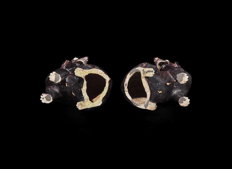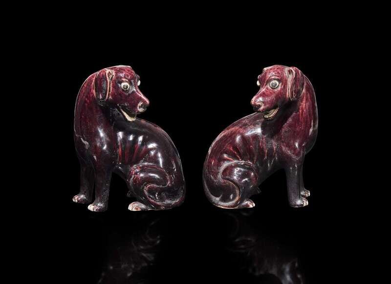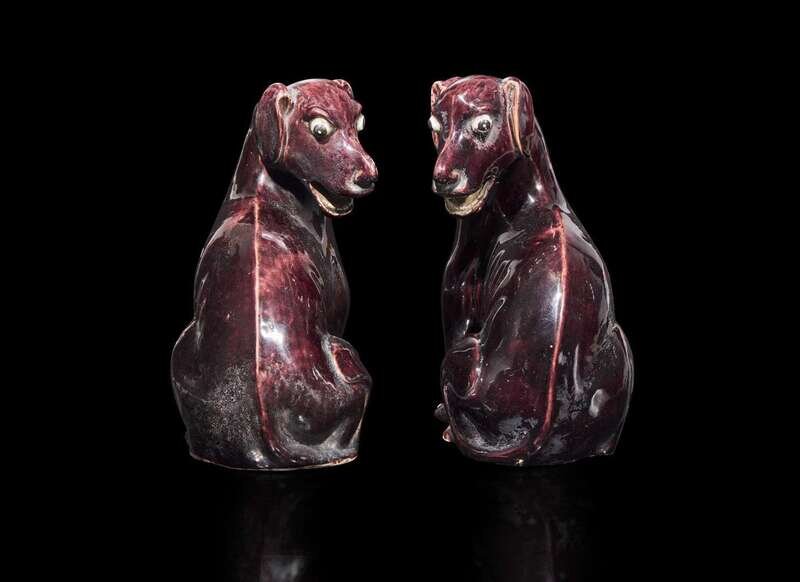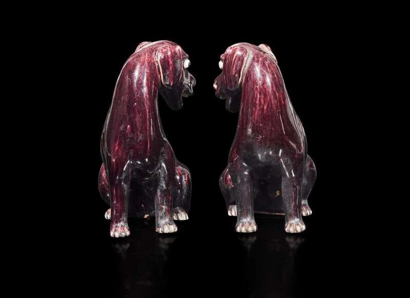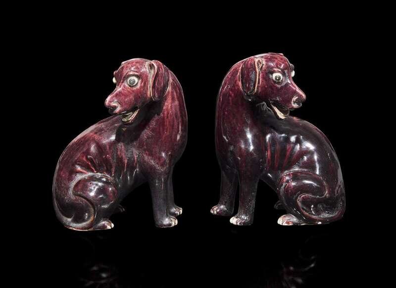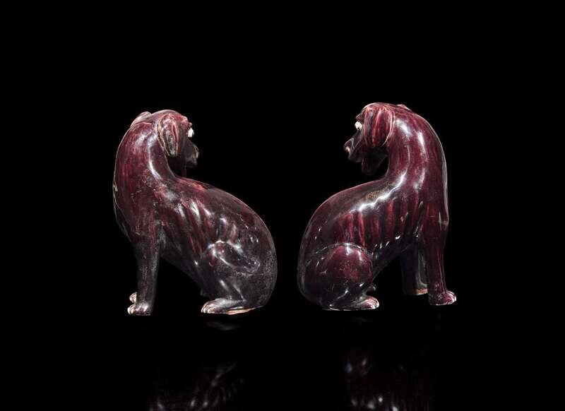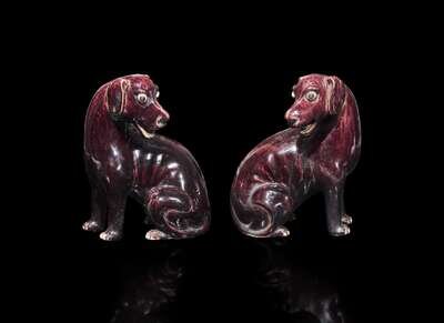A pair of Chinese export aubergine-glazed porcelain seated dogs, 茄紫釉小狗一對