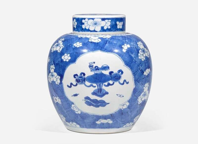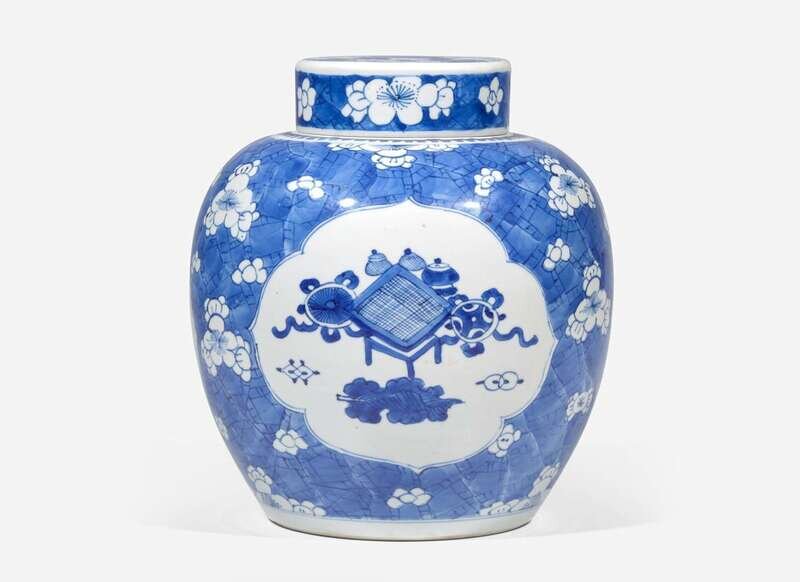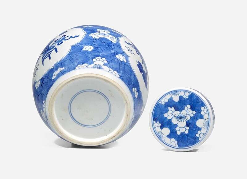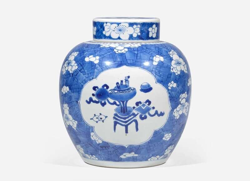 Of globular-shaped body, depicting three panels of antiques, against a prunus and cracked ice ground, double blue circles to the underside