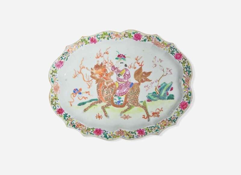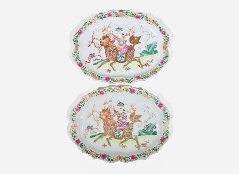 An unusual pair of Chinese export famille rose lobed "Qilin" trays, 18th century 粉彩出口瓷麒麟盤一對 十八世紀