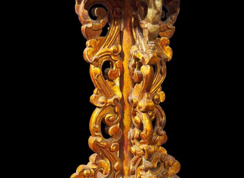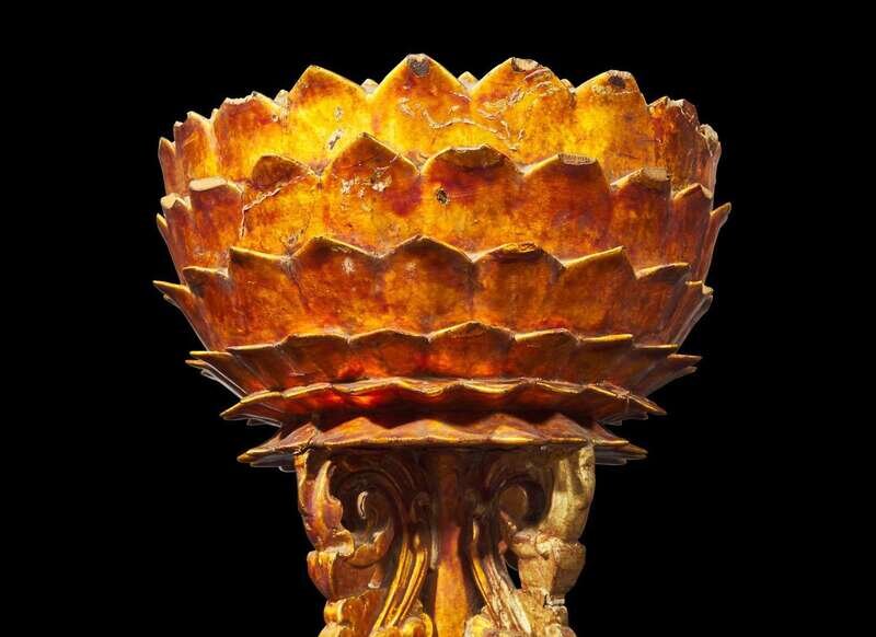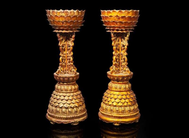 An associated pair of Chinese gilt-lacquered "Lotus" altar stands, Qing dynasty, 18th century or later 漆金蓮花燭臺或一對 清 十八世紀或更晚