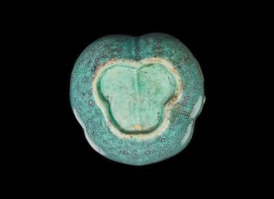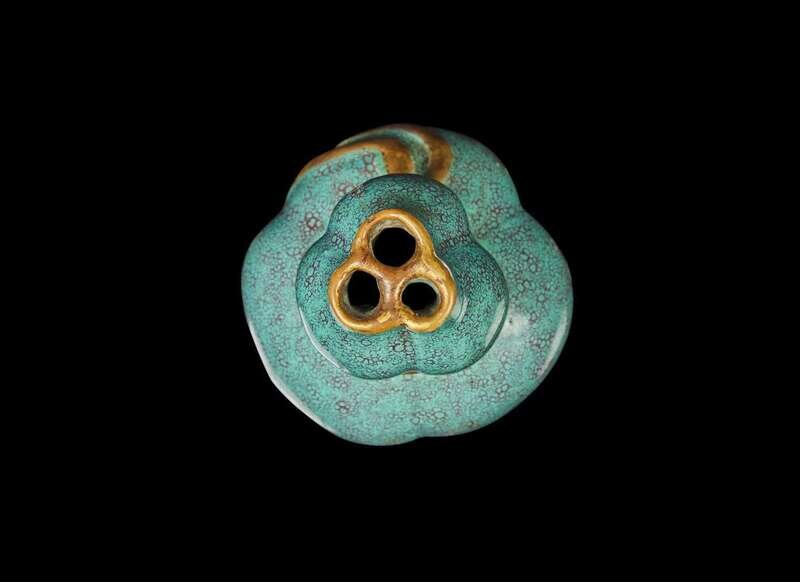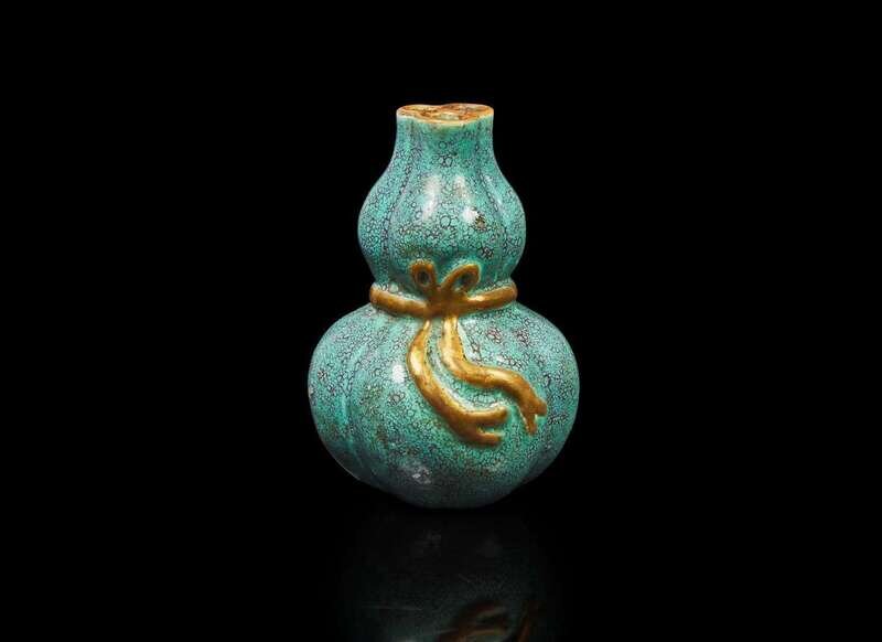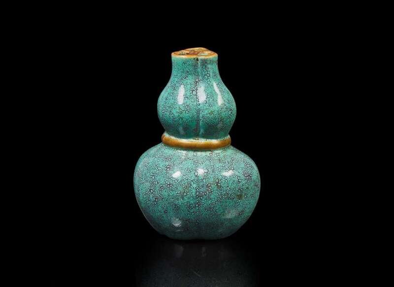 A small Chinese "Robin's-Egg"-glazed molded lobed double-gourd cabinet vase, Qing dynasty 爐鈞釉小葫蘆瓶 清