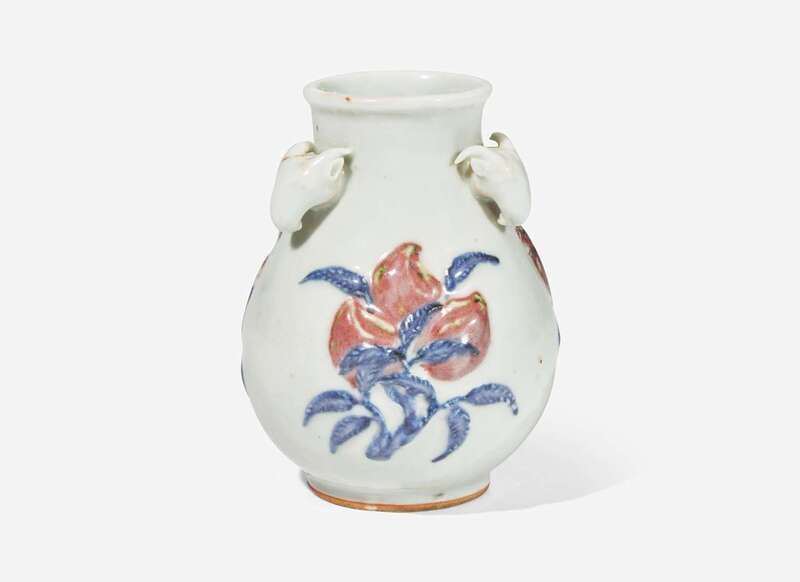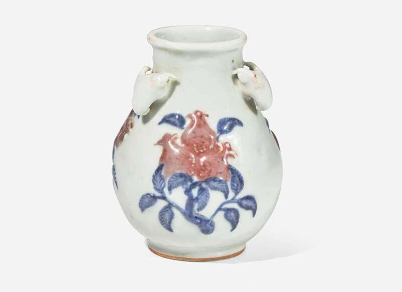 The exterior finely decorated with the "Sanduo": pomegranate, peach, and citron, decorated with underglaze copper-red, all leaves painted with cobalt-blue, and three ram heads to neck, an indistinct molded four-character seal mark to the underside.