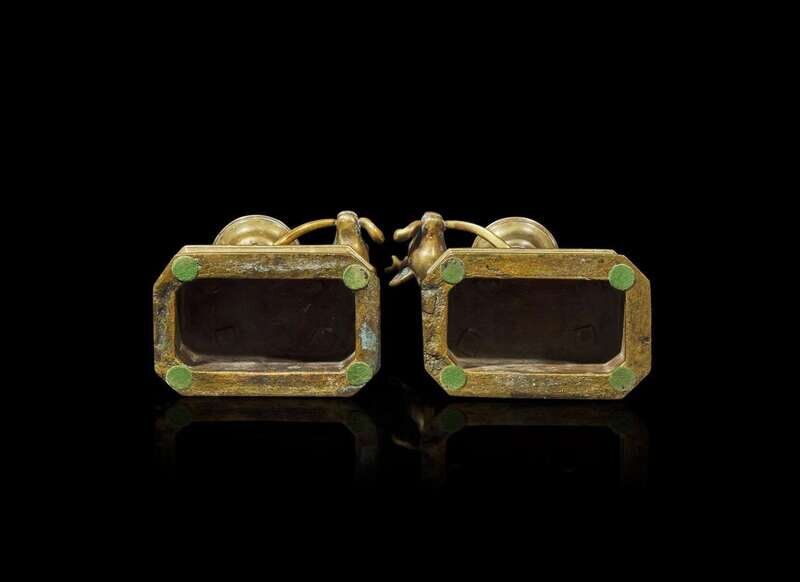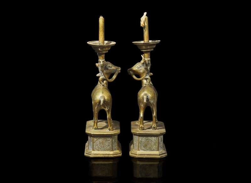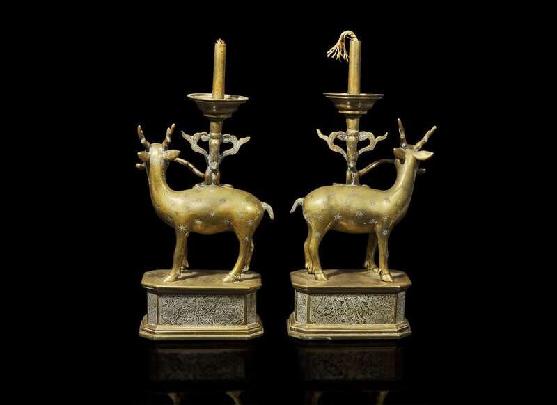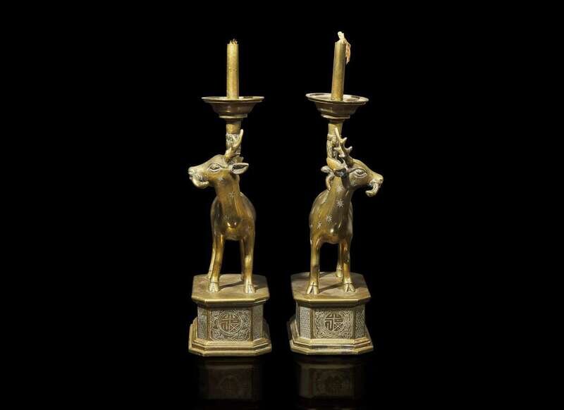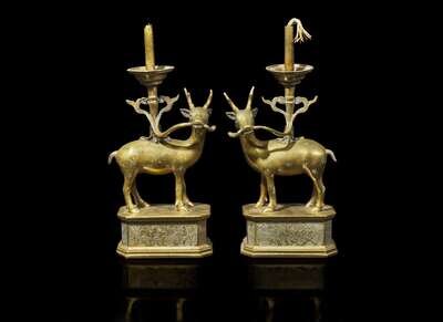 A pair of Chinese huangtong "Deer" lamps, Qing dynasty 鹿形燭臺一對 清