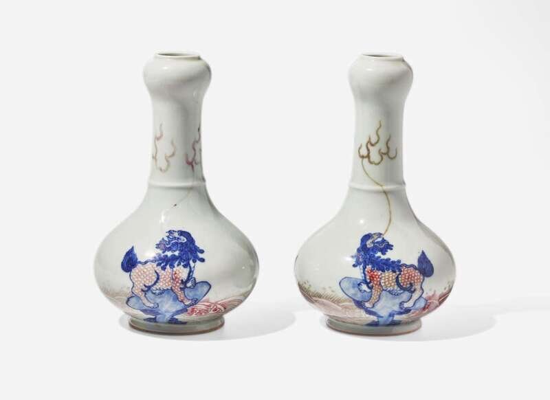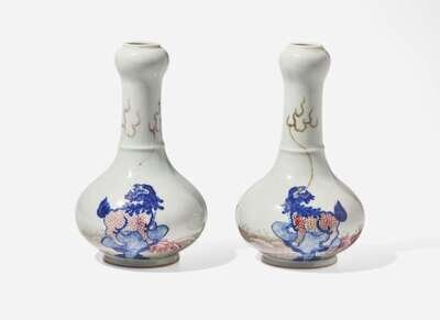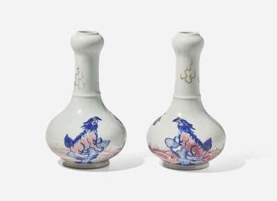 A pair of Chinese underglaze blue and red garlic-head cabinet vases, Kangxi marks 青花釉裡紅蒜頭瓶一對 康熙款