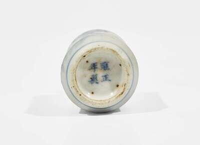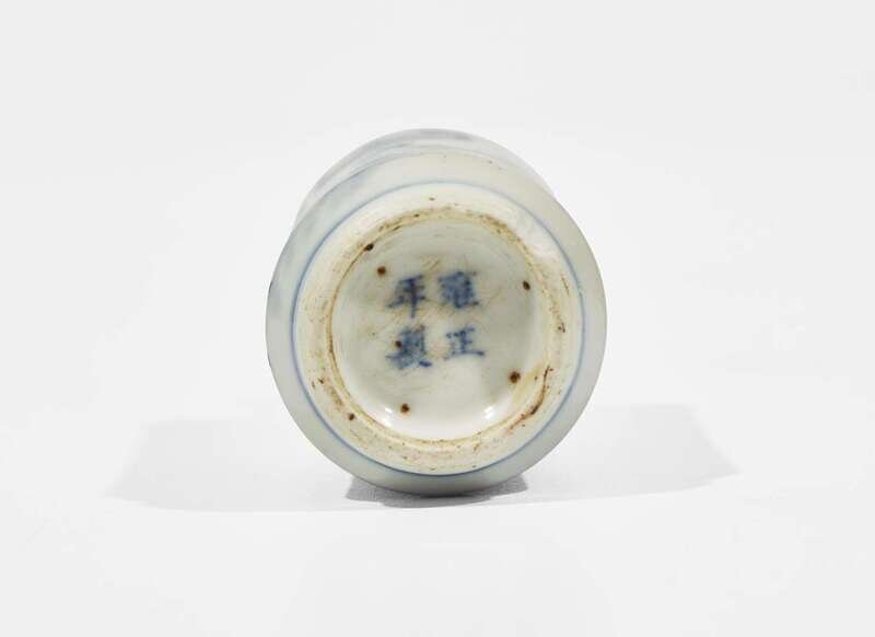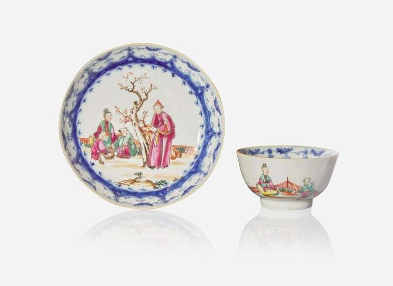 Comprising: a blue and white "Cranes in Garden" charger; a "Boy in Garden" saucer dish; three famille rose figural tea bowls with four matching saucers, and a blue and white snuff bottle with figural decoration, underside with Yongzheng marks