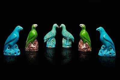 Comprising a pair of green parrots, a pair of turquoise parrots, and a pair of turquoise pigeons