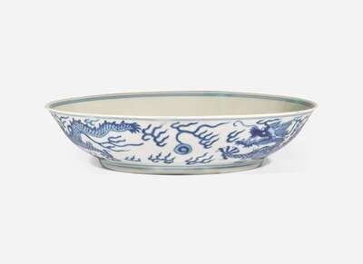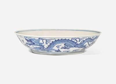 A Chinese blue and white porcelain "Dragon" dish, Jiaqing mark and of the period 青花雲龍紋盤 嘉慶款 清 嘉慶