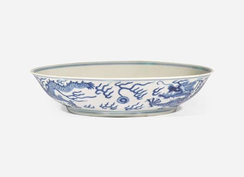 Decorated with a fierce rising dragon amidst clouds to the interior, a classic pattern of two dragons chasing flaming pearls on the exterior, double line borders, six-character Jiaqing mark to the underside.