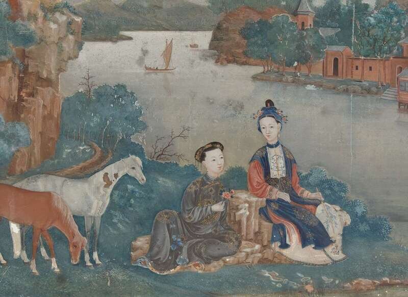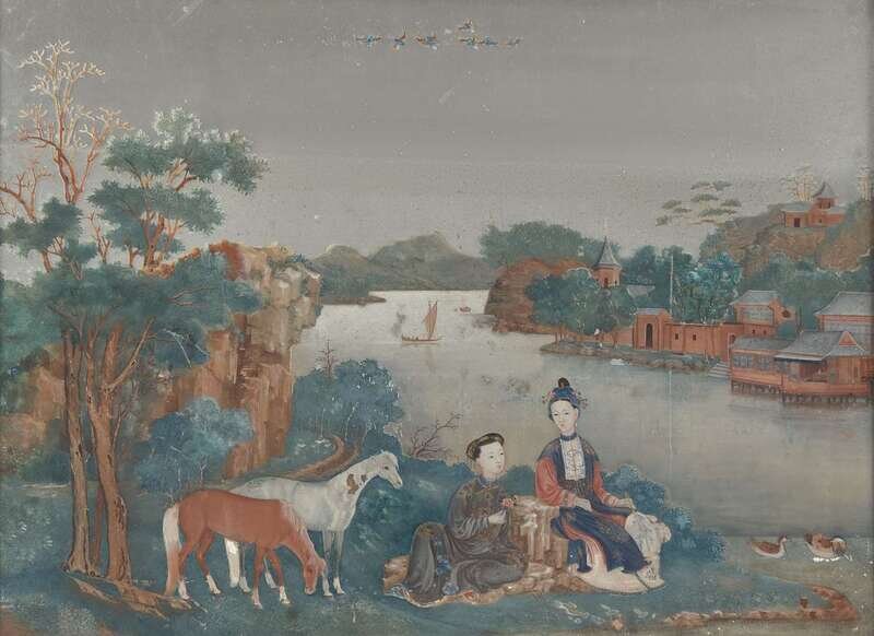 Depicting two elegant meiren in an extensive landscape with two horses, within a western Chinoiserie gilt-decorated bezel, possibly of the period, and a modern outer frame