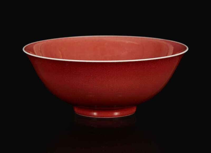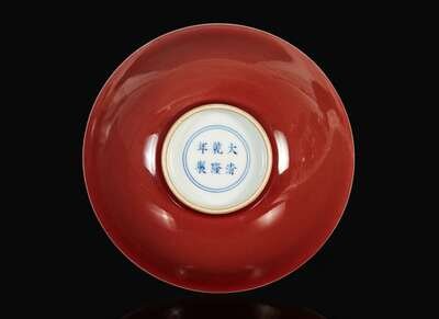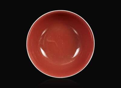 The circular bowl with slightly flared rim, on low circular foot; the glaze a fine, even liver-red tone, white at the rim, underside with six-character Qianlong mark in two horizontal lines of standard script within a double circle.