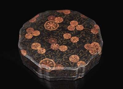 The lacquer mallow flower-shaped case richly decorated with gilt floral and foliage, the interior comprising a set of twelve shaped trays, each painted with immortals in a landscape