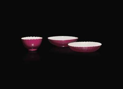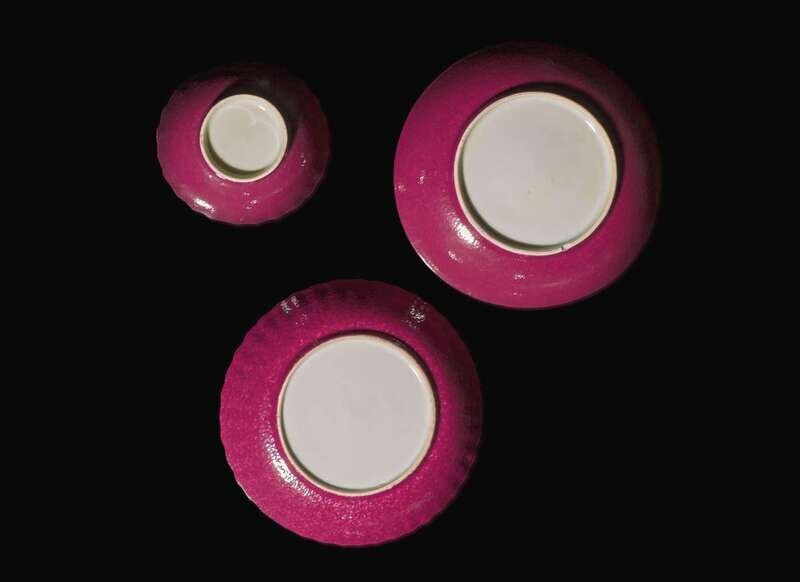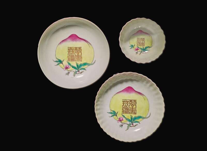 A Chinese ruby-back porcelain "Wan Shou Wu Jiang" "Peach" tea bowl and two saucers, Possibly 18th century 萬壽無疆茶杯及兩小碟 或十八世紀