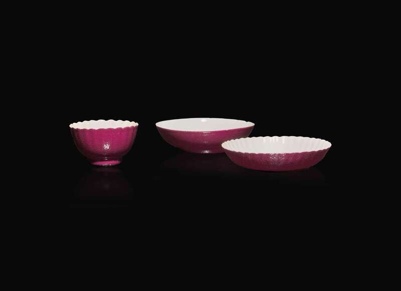 Each with four seal script characters in gold "Wu Shou Wu Jiang" ("long life without end"), against a large peach spray, rich puce-enameled backs, one cup and saucer fluted, the other saucer circular.
