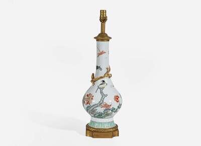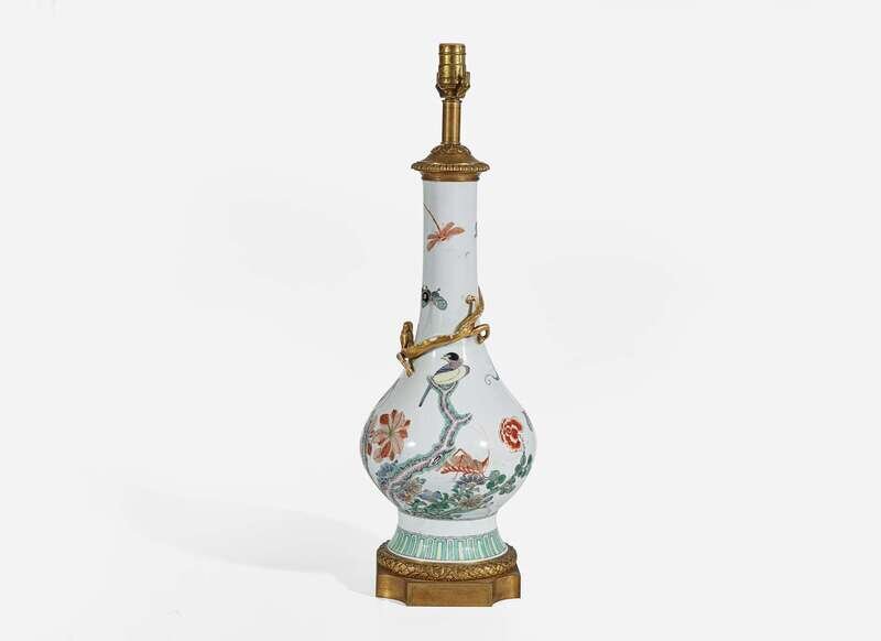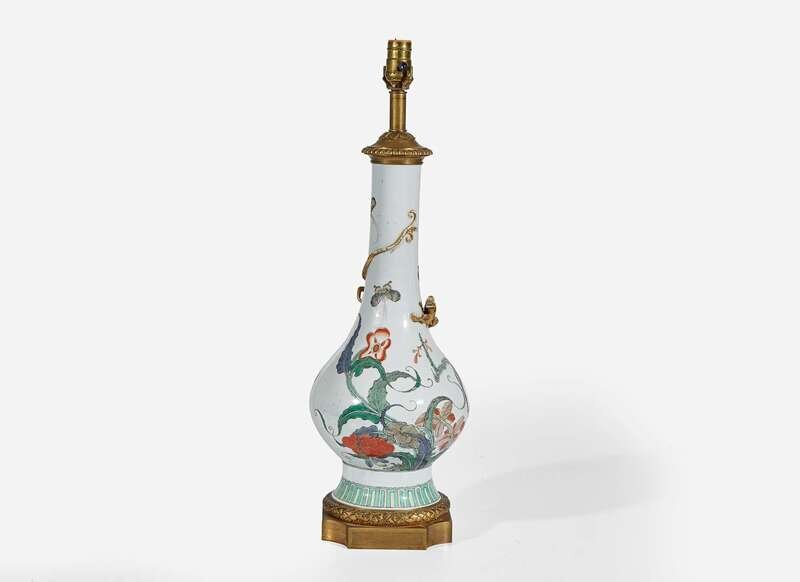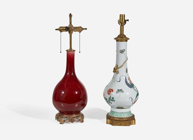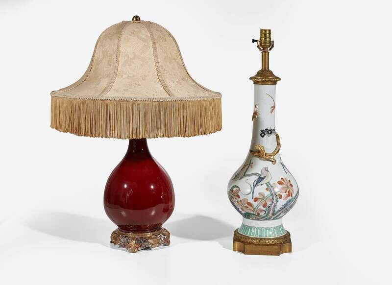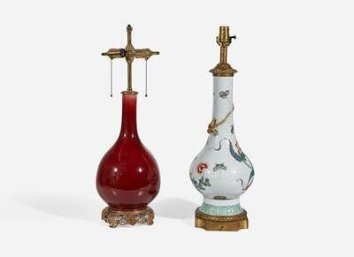 The first of bottle-form, with deep copper-red glaze, bronze chinoiserie mounts, shaped silk custom shade; the second with famille verte decoration of birds, insects and flowers, a gilt dragon encircling the neck, Louis XVI style ormolu mounts
