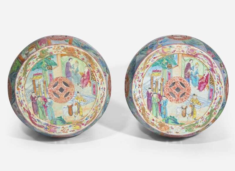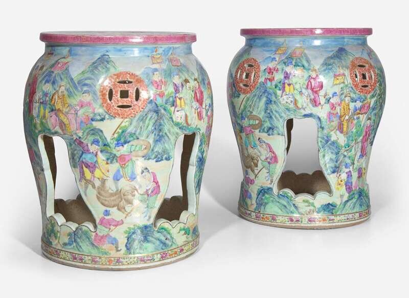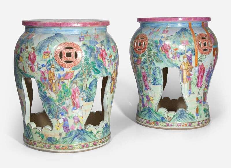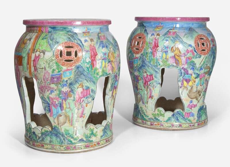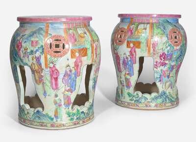 An unusual pair of Chinese export porcelain famille rose-decorated garden stools, first half 19th Century 粉彩繡墩一對 十九世紀初