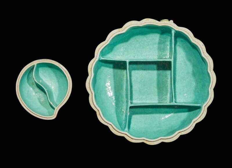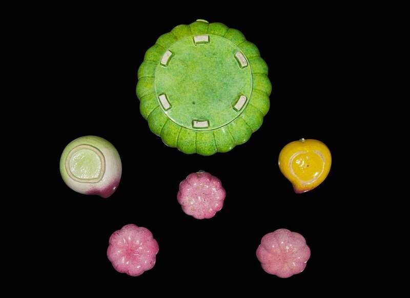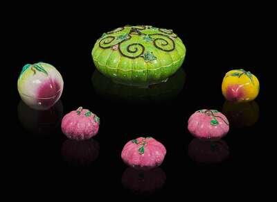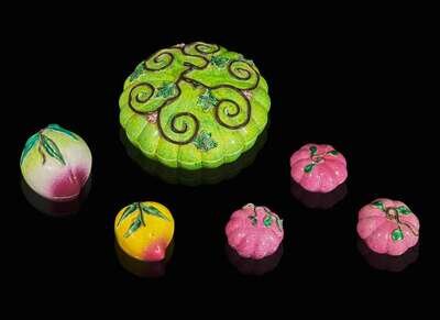 Comprising a large melon-form box with compartmented interior, a peach-shaped box with divided interior, one peach and three small melon-form table ornaments