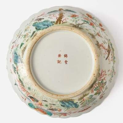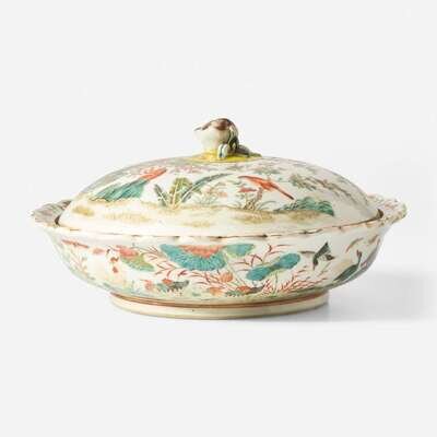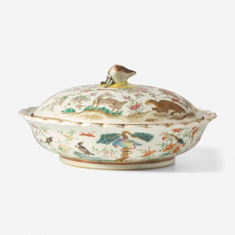 With scalloped rim and low domed cover with peach finial, decorated with various animals and birds among flowering trees, flowers and rockwork, underside with four-character mark in iron-red