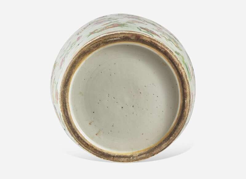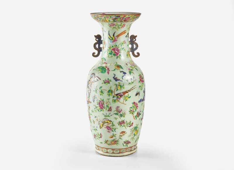 A Chinese famille-rose decorated molded celadon ground vase, 19th century 粉青地粉彩模印貫耳瓶 十九世紀