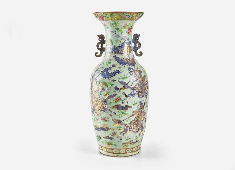 Half of the vase decorated with various figures in combat with underglaze blue and gilt, the other half with auspicious birds and flowers, the neck flanked by a pair of dragon shaped handles, all against celadon ground.