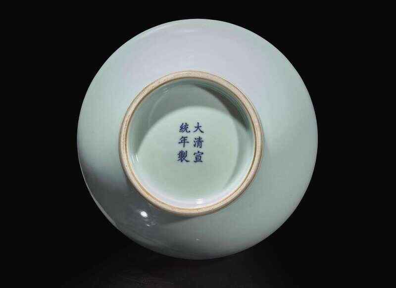 The vase covered in a pale sky blue glaze, with two raised strings decoration to shoulder, six-character Xuantong mark to the underside.