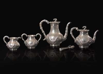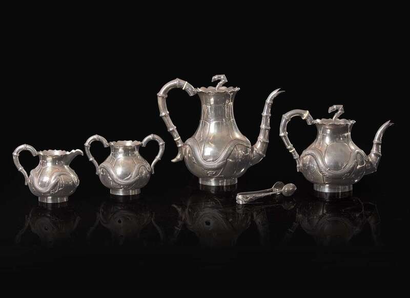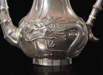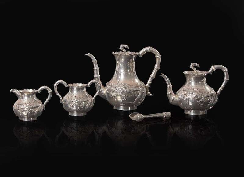 A Chinese export silver five-piece "Dragon" tea and coffee service and tongs, mark of Zeewo, Shanghai, late 19th to early 20th century 一組五件銀質咖啡器及茶具 Zeewo款 上海 十九世紀末至二十世紀初