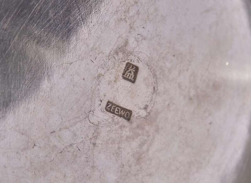 The pomegranate-form bodies decorated in high relief with fierce, sinuous five-clawed dragons, "bamboo" handles and finials, undersides with stamped marks for Zeewo, "Yi", tongs unmarked