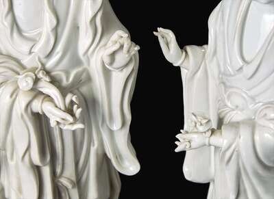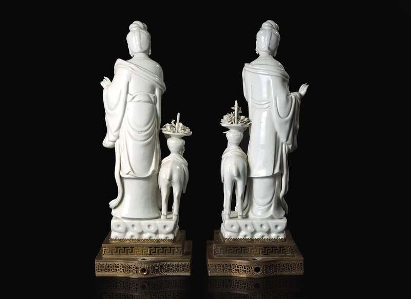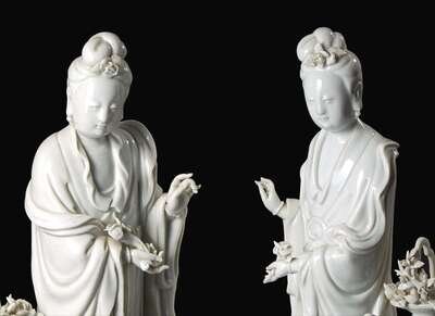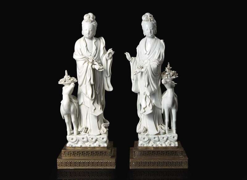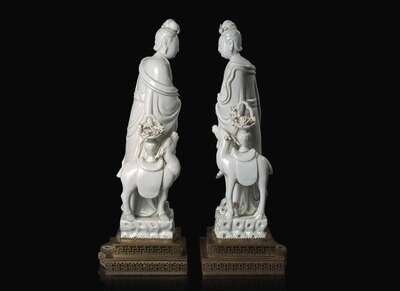 A pair of Chinese Blanc de Chine Figures of Meiren with Deer, Xu Yunlin Zhi impressed mark 德化窯仕女仙鹿瓷塑一對 許雲林製款