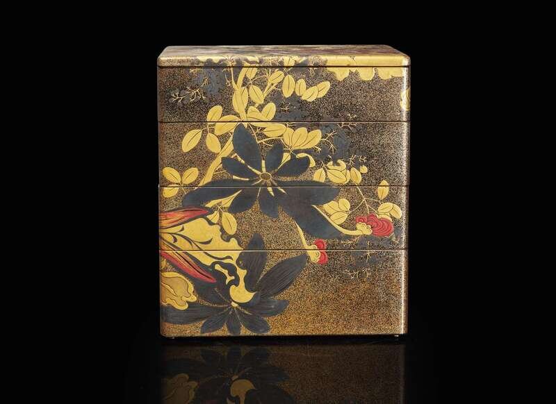 A Japanese black, gold and red-lacquered four-tier picnic box 日本四層紅金漆盒