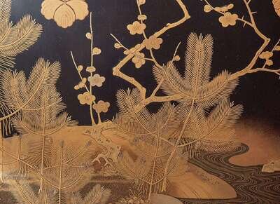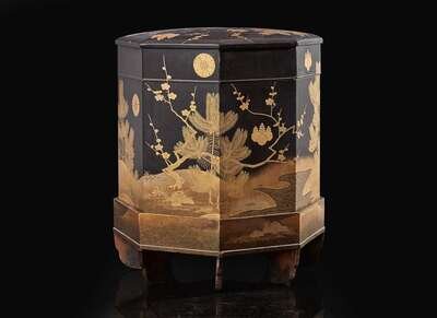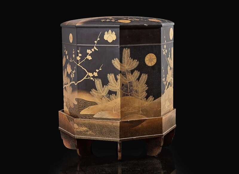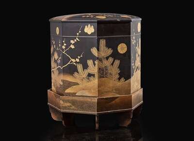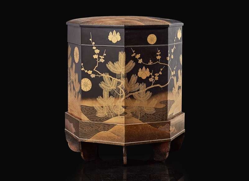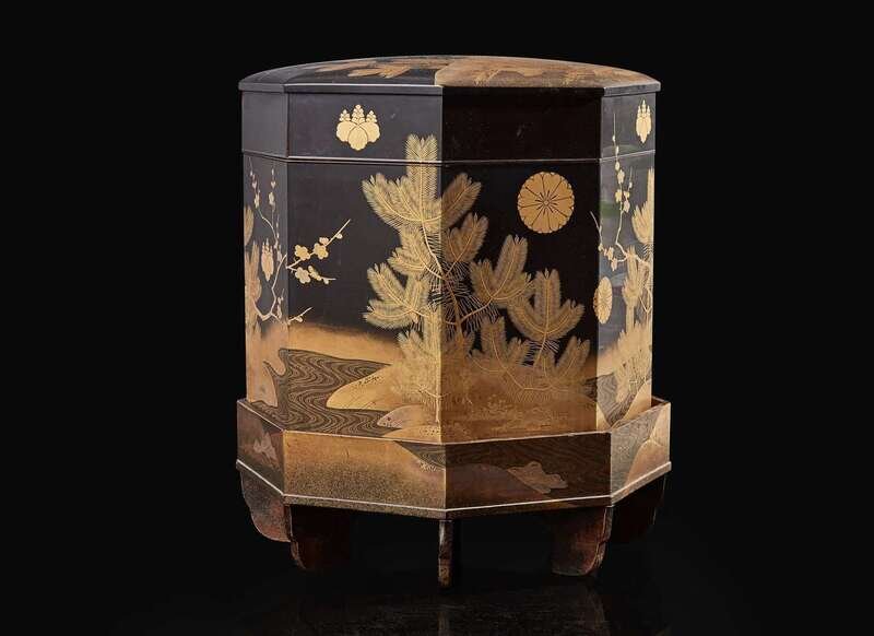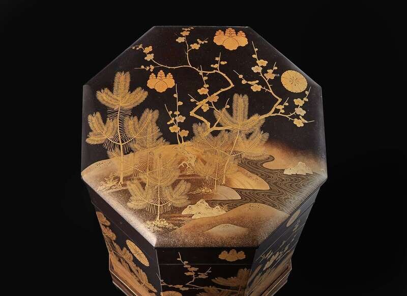 The octagonal box finely decorated with prunus and pine seedlings by a stream, embellished with kiku and kiri mon crests, the interior lined with gold and beige silk brocade in a lotus-scroll pattern.