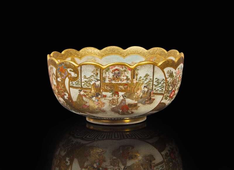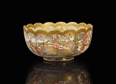 With scalloped rim, the interior decorated with a group of aristocrats before a high dignitary, landscape and brocade reserves; similar figural reserves to the exterior, elaborate gilt borders, underside with artist's seal