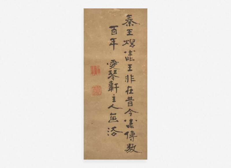 Possibly Guangxu 28th year or later, equivalent to 1903; Inscribed and three signed Ai Qin Xuan Zhu Ren, one signed Jiao Zhizhong, and with two seals upper center, a third seal lower right; mounted as hanging scrolls