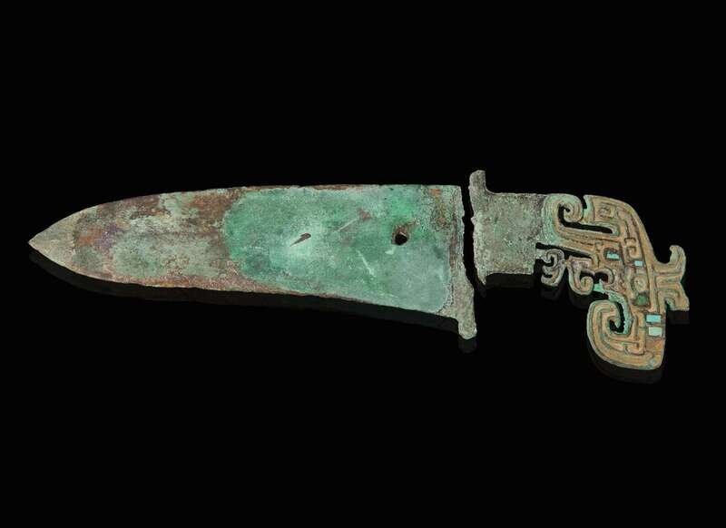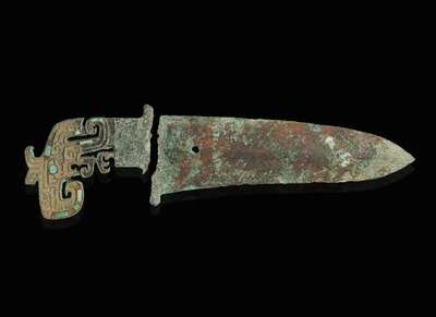 A Chinese archaic-style turquoise-inlaid bronze dagger 青銅嵌綠松石匕首