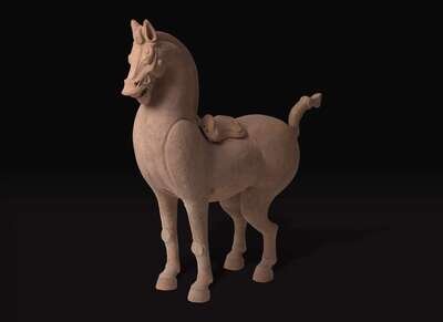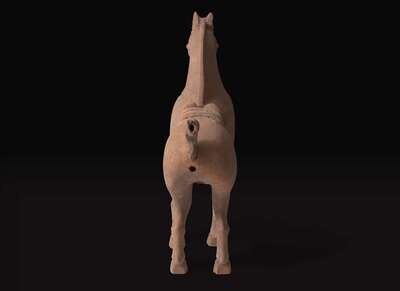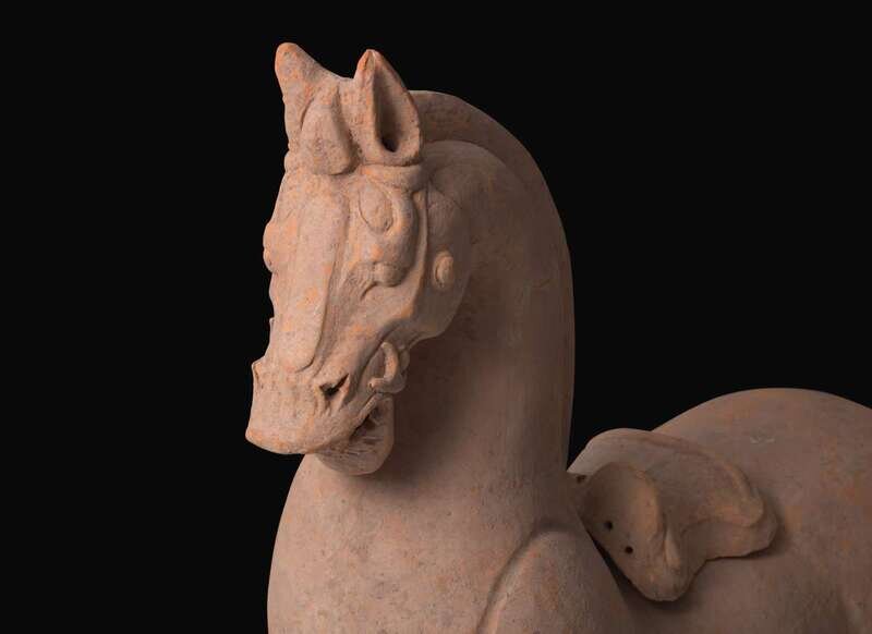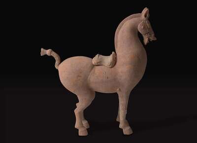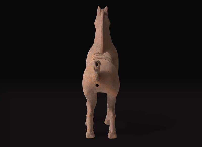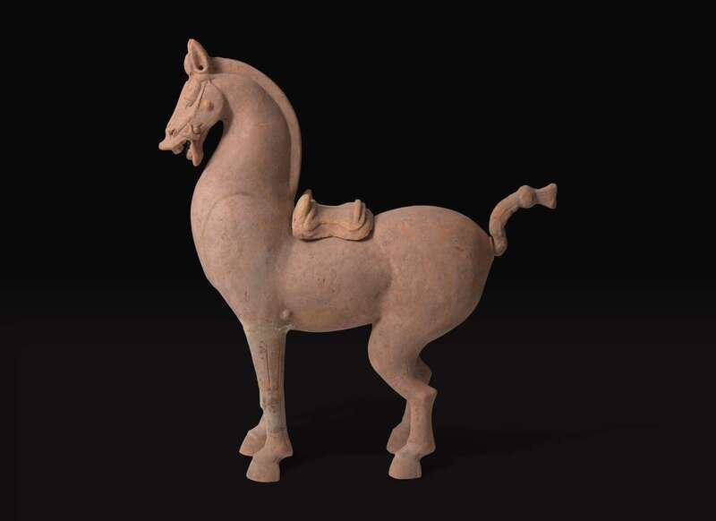 Standing foursquare with arched neck and lowered head, removable saddle and tail; accompanied by a photocopy of a thermoluminescence report from Oxford Authentication, #C105z42, dated August 31, 2005, stating that the results are consistent with the suggested Tang dynasty period of manufacture