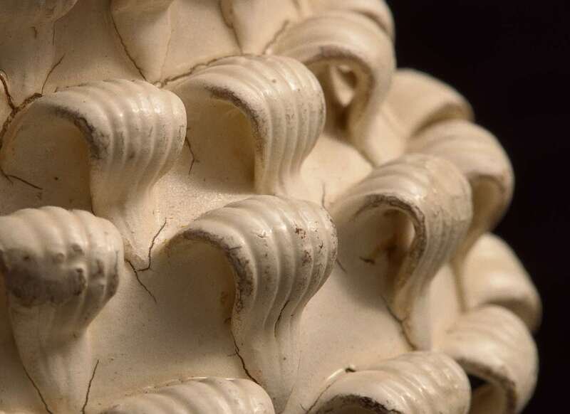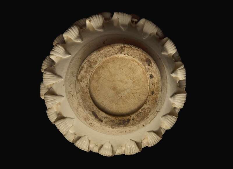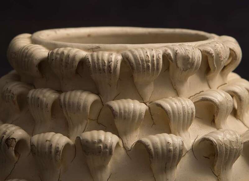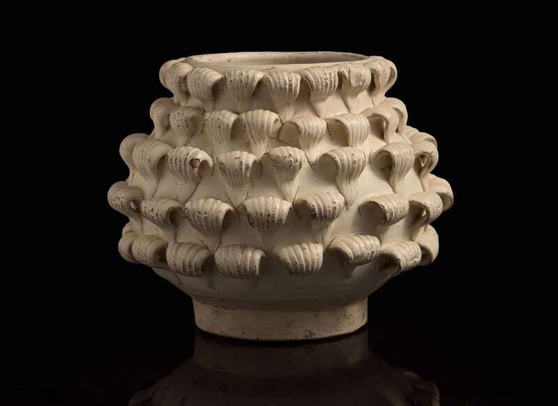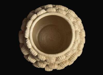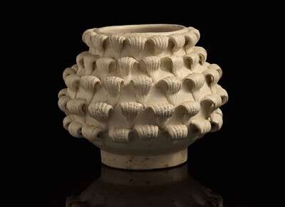 The bulbous jar raised on tall circular foot, the exterior with five rows of applied ridged "petals", the fine pale beige ceramic body with thick cream-colored slip; the underside with wide and shallow foot ring.