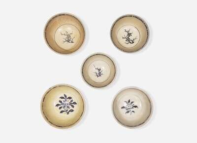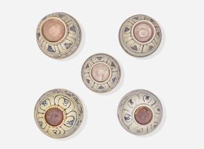 Variously decorated with central florets or prunus sprays to the wells, exteriors with lotus lappets, and chrysanthemum and lotus band borders Dias: 6 1/2 in to 5 1/4 in.