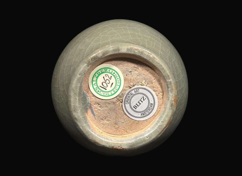 Of pyriform with waisted, slightly flared neck with a pair of open lug handles, all on a low circular foot, the celadon-grey glaze with a fine network of pale craquelure