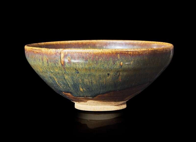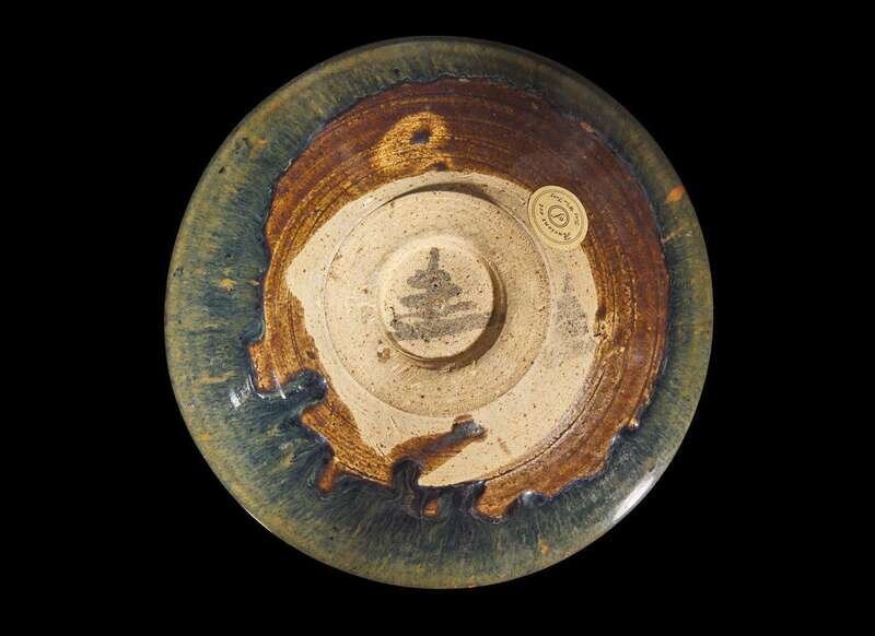 The bowl partially covered with olive brown glaze with russet splashes, ink inscription to the underside.