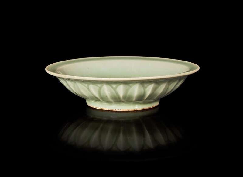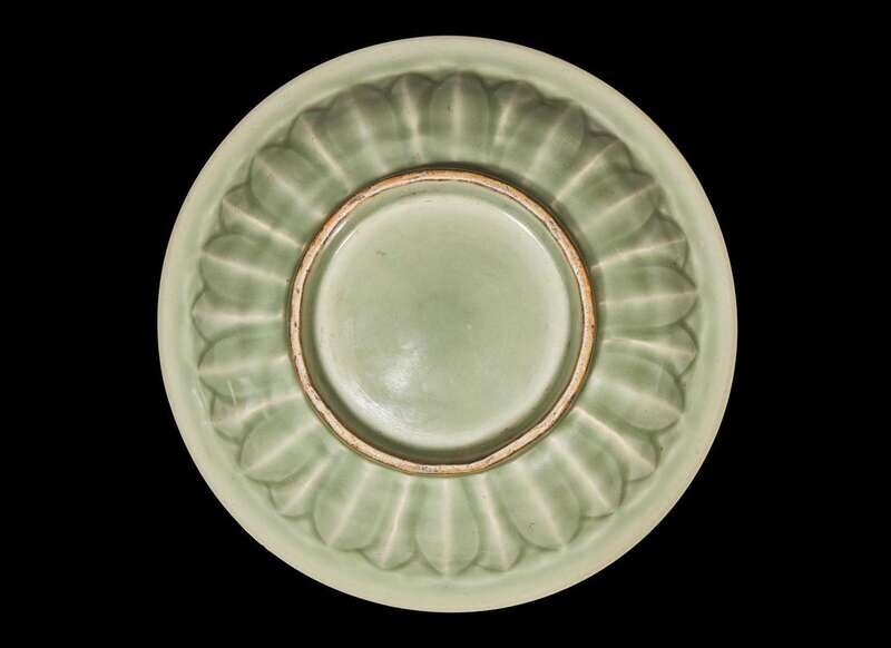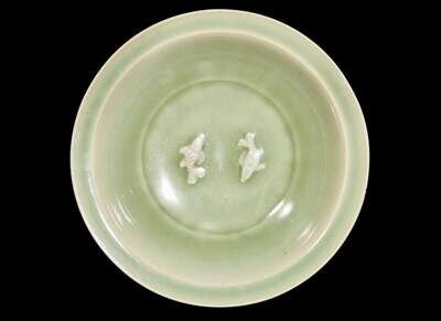 The circular dish with two applied fish in the center, the exterior modeled as lotus petals, attractive sea-green glaze