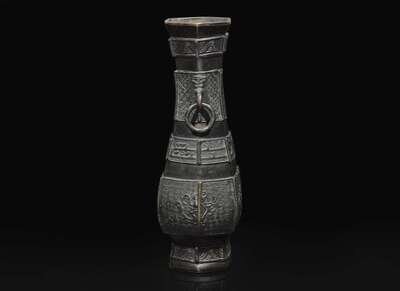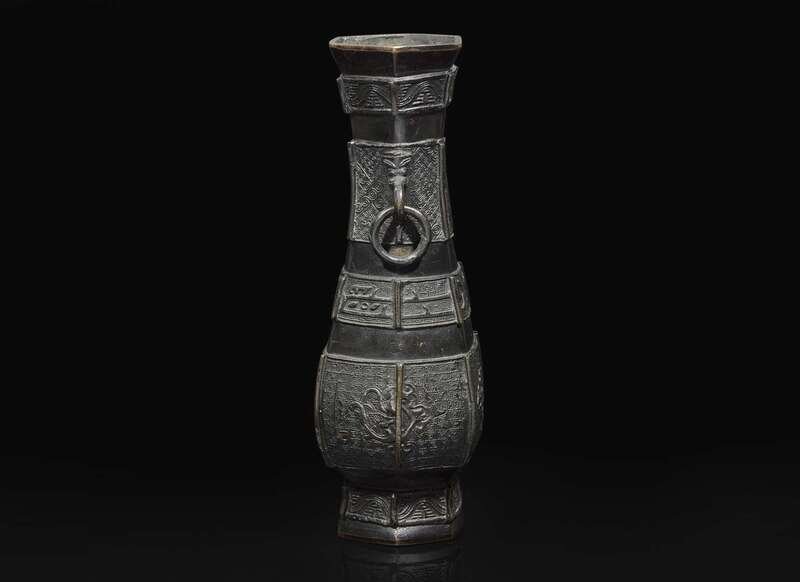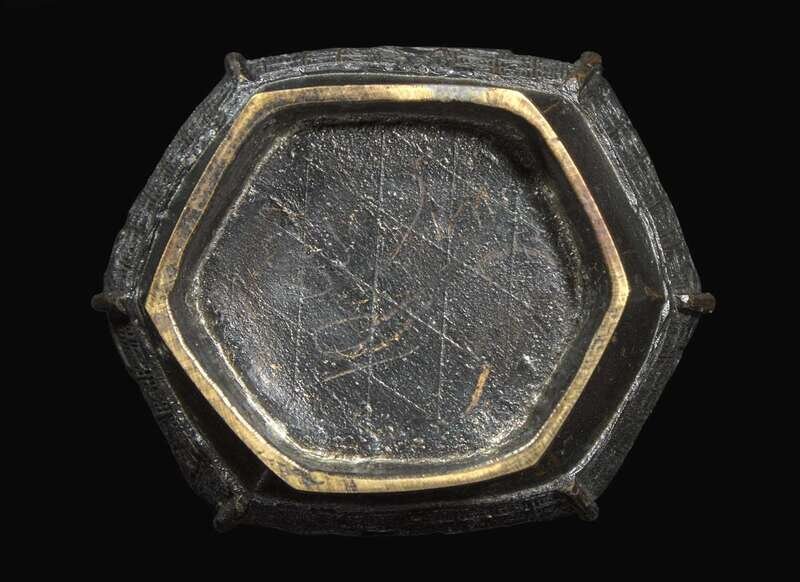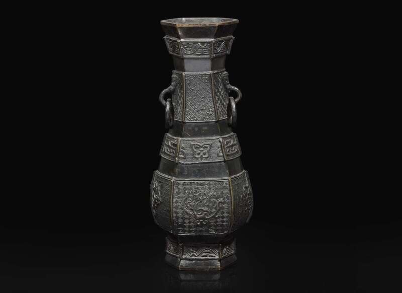A Chinese patinated bronze hexagonal vase, Yuan to Ming Dynasty 加漆六方銅瓶 元或明