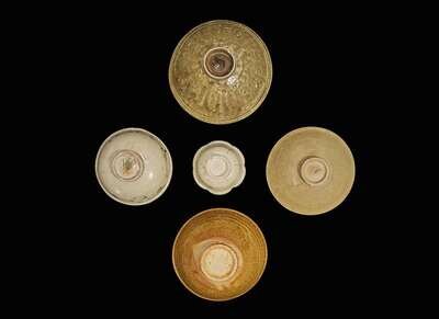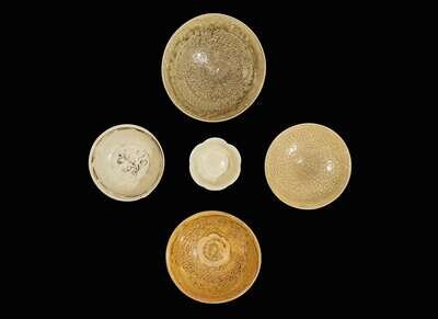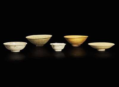 Comprising: a small hexafoil bowl with pale celadon glaze; an iron brown-decorated bowl; an olive brown-glazed lotus-molded bowl; an olive green-glazed lotus-and scroll-molded bowl; an olive green floral-molded or incised shallow bowl
